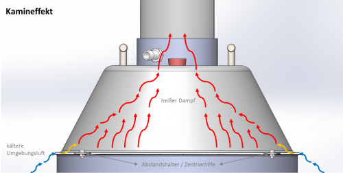 Mit dieser Brüdenhaube wird der entstehende Dampf beim Kochen zuverlässig abgeleitet. Die 2 Griffe erleichtern das Handling ungemein. Zusätzliche Hopfengaben, während des Kochens, können durch das dafür vorgesehene Loch (Ø25mm) vorgenommen werden. Die Abstandshalter, die zwischen der Haube und dem Braukessel angebracht werden und gleichzeitig als Zentrierhilfe dienen, sorgen dafür, dass der "Kamineffekt" optimal zur Geltung kommt.