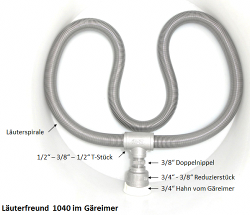 Dieses Produkt erleichtert das Läutern und wird zum Freund des Hobbybrauers! Die flexible Form ermöglicht einen Einbau in nahezu jeden Behälter. Der definierte Abstand zwischen den einzelnen Windungen ist so optimiert, dass ein ideales Läuterergebnis erzielt wird. Im Lieferumfang ist eine Reduziermuffe (3/4" auf 3/8"), ein Doppelnippel (3/8" auf 3/8"), ein T-Stück (1/2" - 3/8" - 1/2") und die Läuterspirale enthalten.